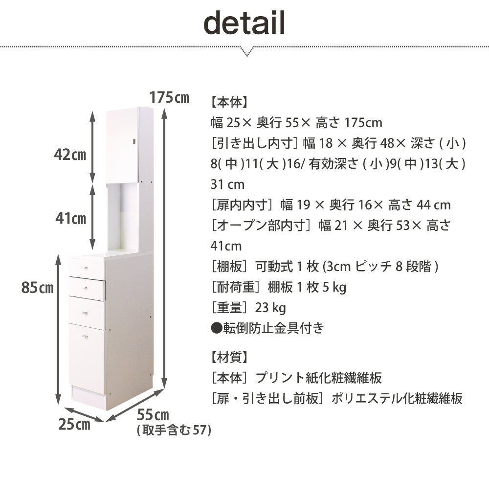 【本体】 幅30×奥行55×高さ175cm [引き出し内寸]幅23 ×奥行48×深さ(小)8(中)11(大)16/有効深さ(小)9(中)13(大)31 cm [扉内内寸]幅24 ×奥行16×高さ44 cm [オープン部内寸]幅26 ×奥行53×高さ41cm [棚板]可動式1枚(3cmピッチ8段階) [耐荷重]棚板1枚5 kg [重量]26 kg ●転倒防止金具付き 【材質】 [本体]プリント紙化粧繊維板 [扉・引き出し前板]ポリエステル化粧繊維板同シリーズの他幅タイプ